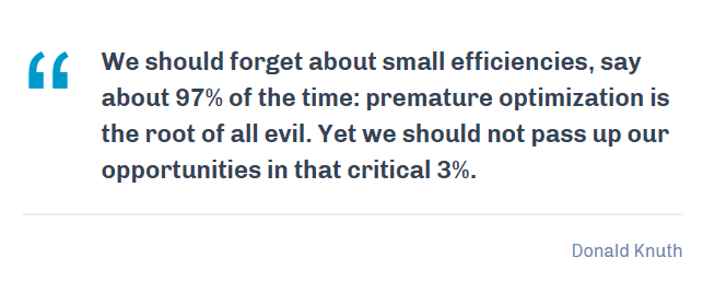 > We should forget about small efficiencies, say about 97% of the time: premature optimization is the root of all evil. Yet we should not pass up our opportunities in that critical 3%.