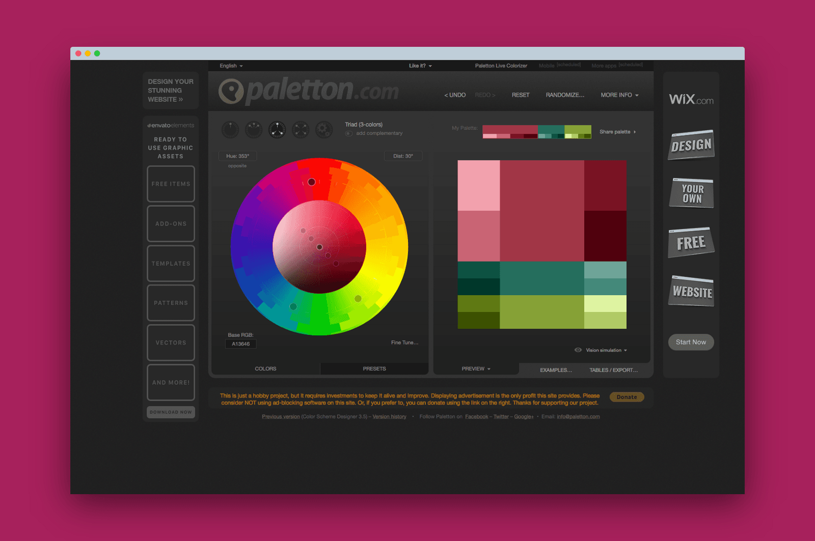 Paletton takes on the scientific approach to find the right palette by adjacent and triad colors. It has plenty of previews and simulations to accommodate different scenarios for palette usage.