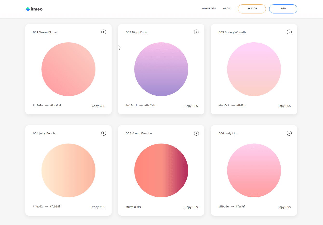 Subtle color gradients collection made for website or app background. CSS code, PNG, Sketch and PSD previews are all set to use right away.