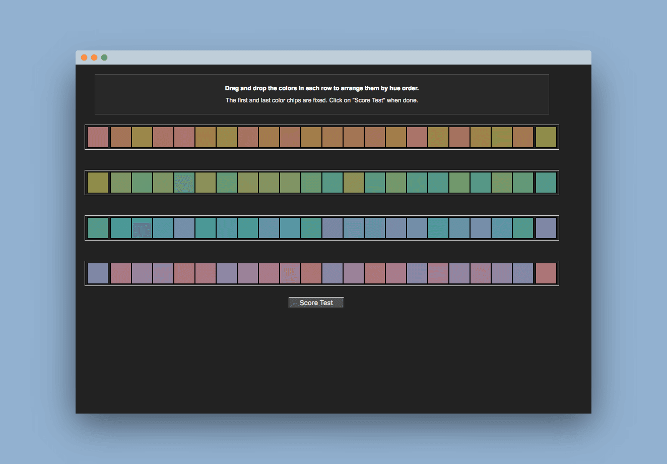 Train your eyesight to be laser-like. Munsell Hue Test is a fun yet challenging game to arrange color block by hue order. Lower the score is better.