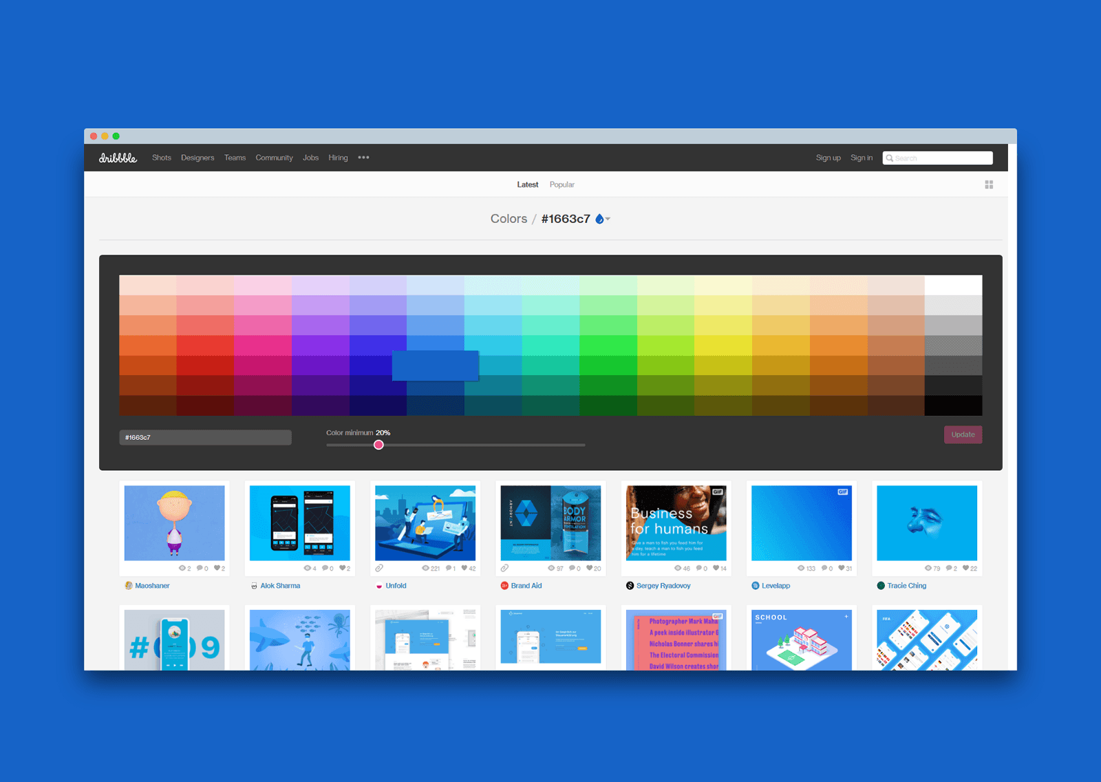 Dribbble Colors is a hidden treasure for UI designers who are looking for case studies of color adoption. It allows users to search Dribbble shots by color using hex code. Users also can adjust percentage of the containing color within a shot. This tool comes handy to see how a color plays out in other design.