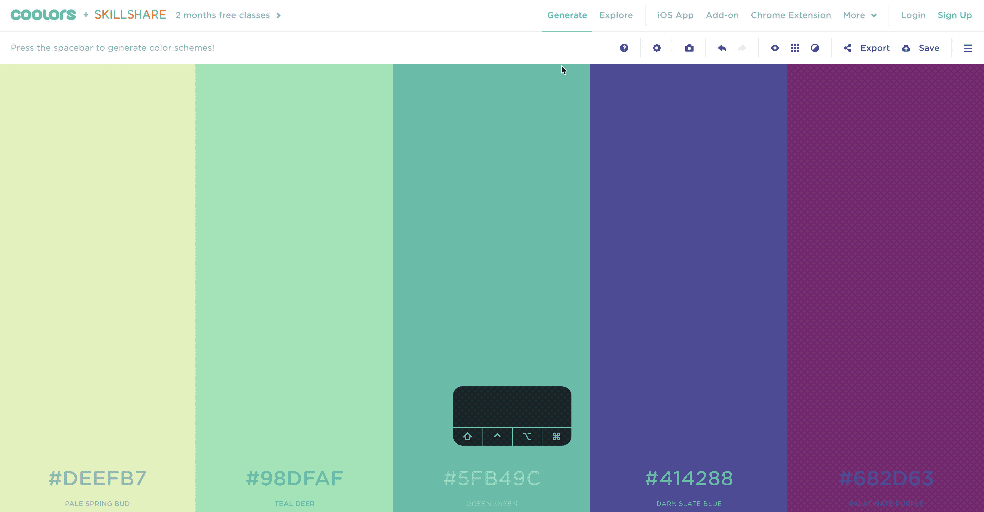 Coloors.co’s Color-blind Mode and Hue & Contrast Adjustment is user-friendly to fine tune your palette Coolors.co is a multi-color schemes generator, with a super-fast spacebar shortcut to generate color schemes instantly. Thoughtful features including colorblind mode, able to view shades and adjust hue and saturation have contributed it to be my favourite site for color inspiration. It also has paid upgrade for iOS App, Chrome Extension, and add-on for Adobe Creative Suite.