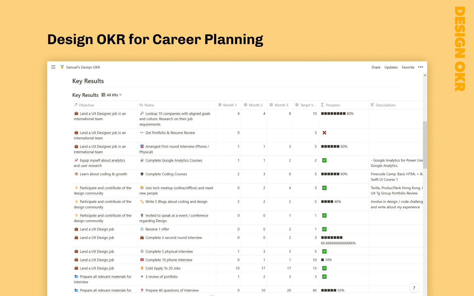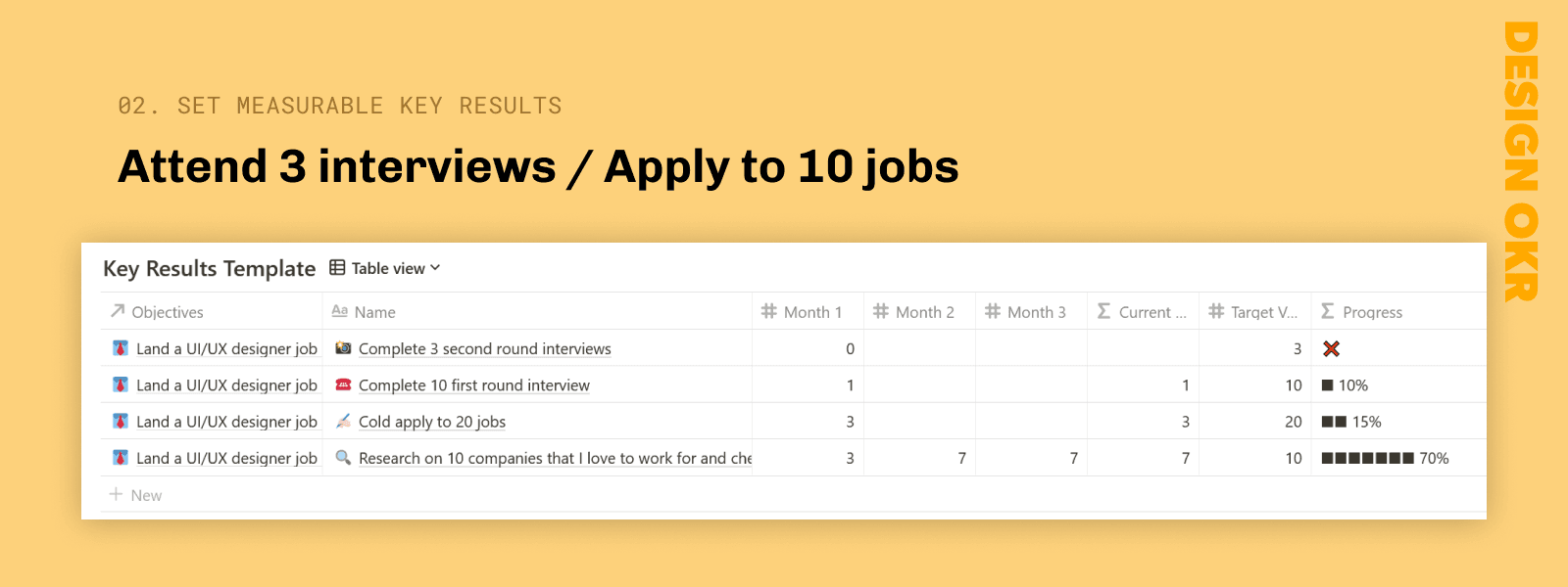 - Then, you can now fill in "Key Results" table. Select Objectives first, it will auto roll up options for choosing. Each row is for 1 key result but you create multiple key results belong to the same objective. Just like Land a full-time UX Job has 4 key results. Key results are almost always defined with numbers, so you can measure the success. You should also fill the target value. At the end of each month, you will update your progress to Month 1 / 2 / 3 columns. You may also want to log your accomplishment in the Descriptions column too.