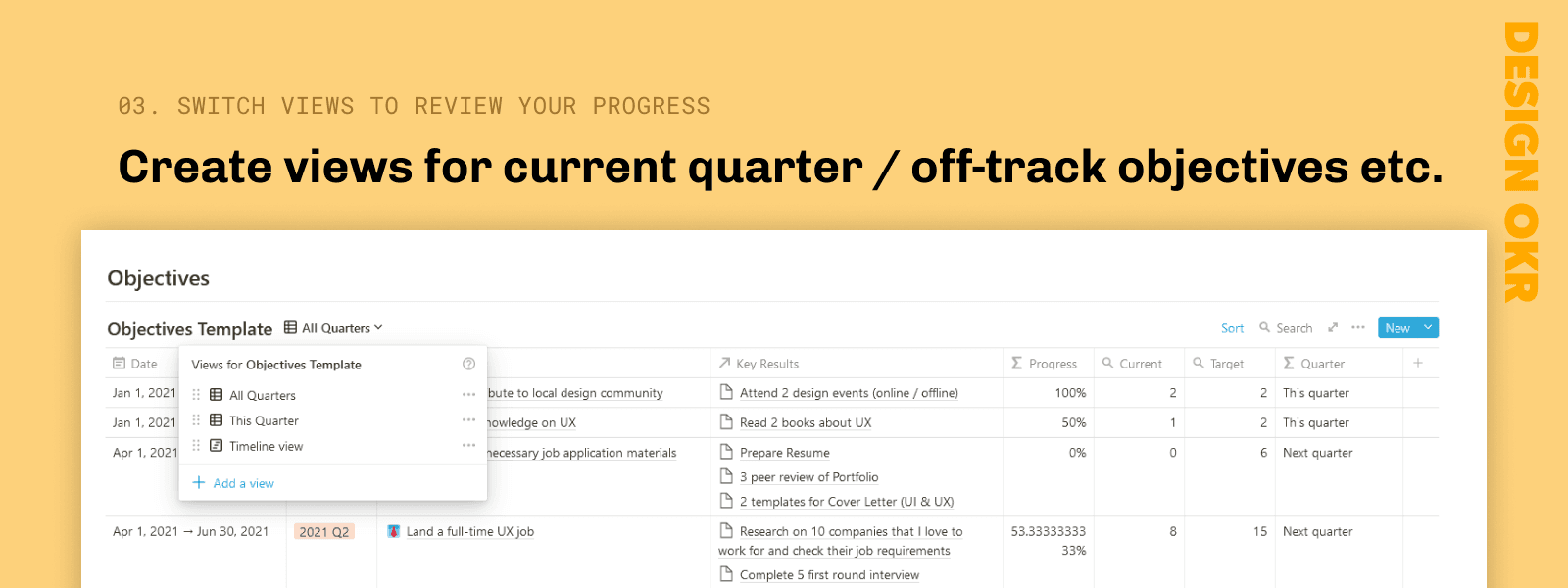 The definition of “OKRs” is “Objectives and Key Results. What it means, is to set goals and track the progress regularly (usually by quarters). One important thing to note, is that objectives have to be supported by measurable key results, usually with numbers. Career-wise, it may be difficult to find things to measure, but it's okay. Numbers do not need to be big to be succesfful, my results usually are small, like 3 people to review my portfolio, complete 2 courses.