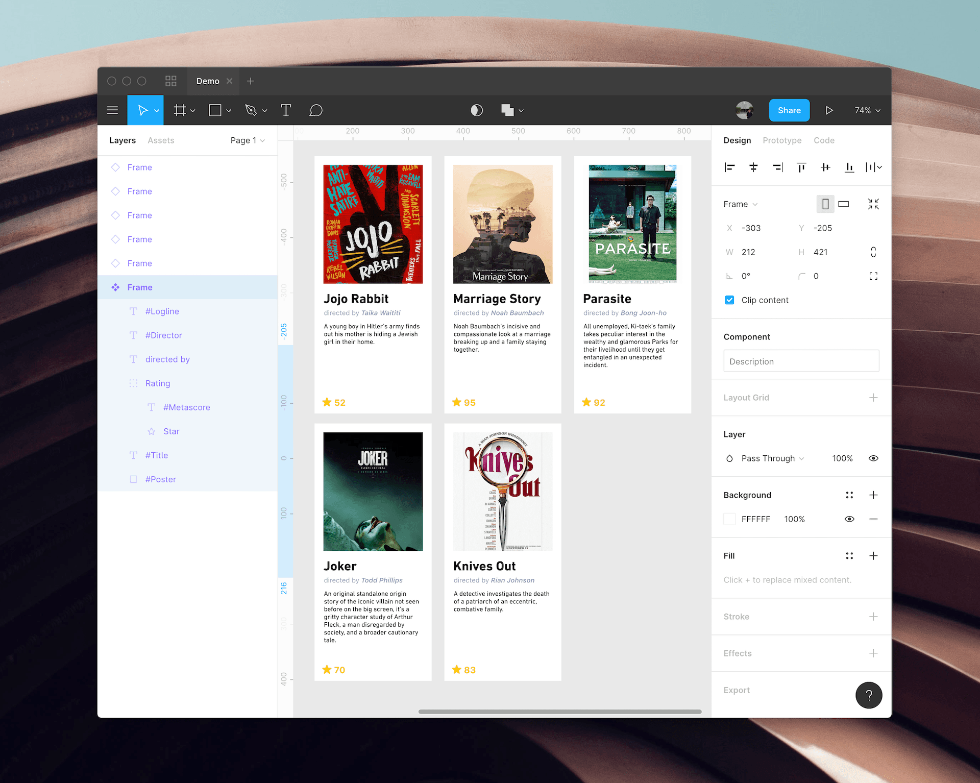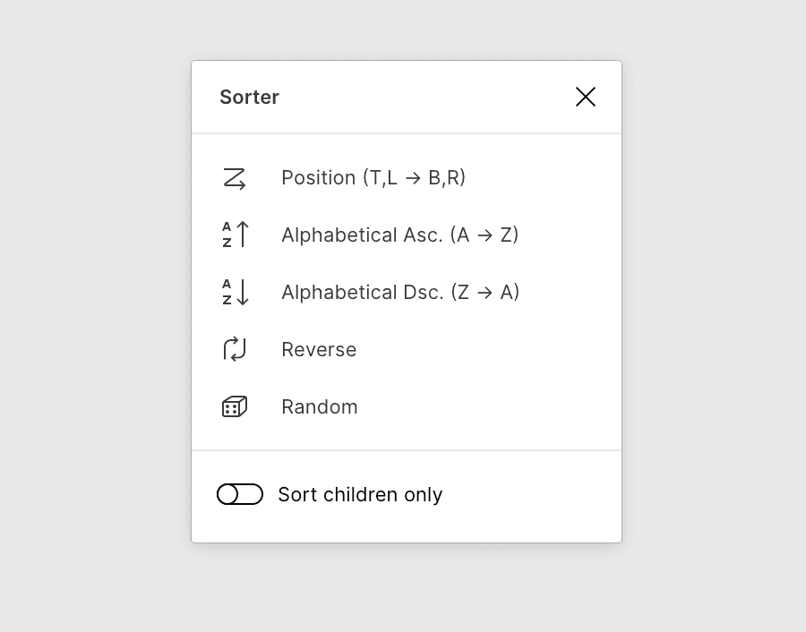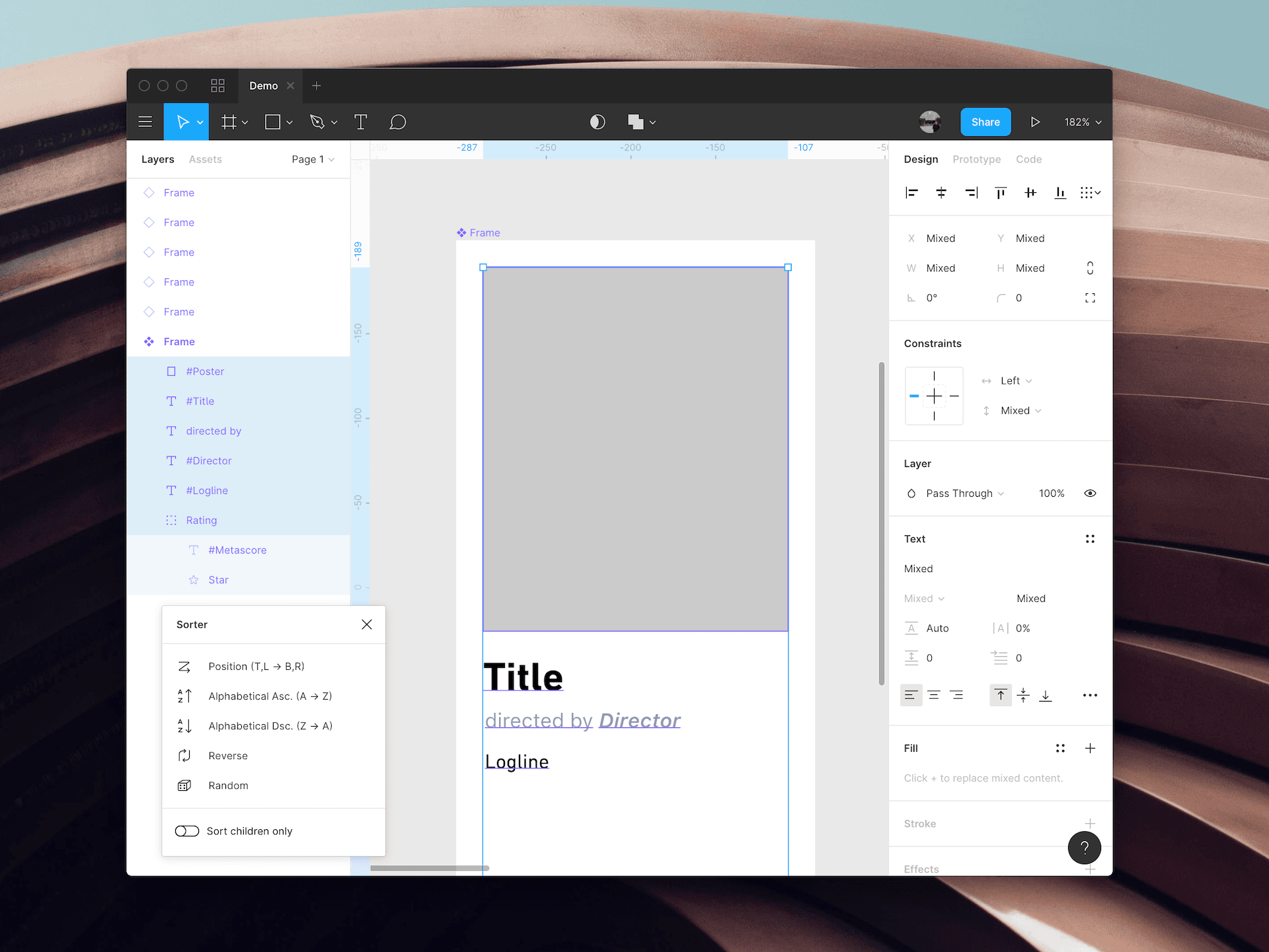 For example, in the previous demo, the movie card components are sorted randomly. Select all layers within the component and open Sorter, it will allow you to pick different sorting rules. For me “Position (Top Left to Bottom Right)” is the most useful for HTML or any component structures. It’s just one simple click.
