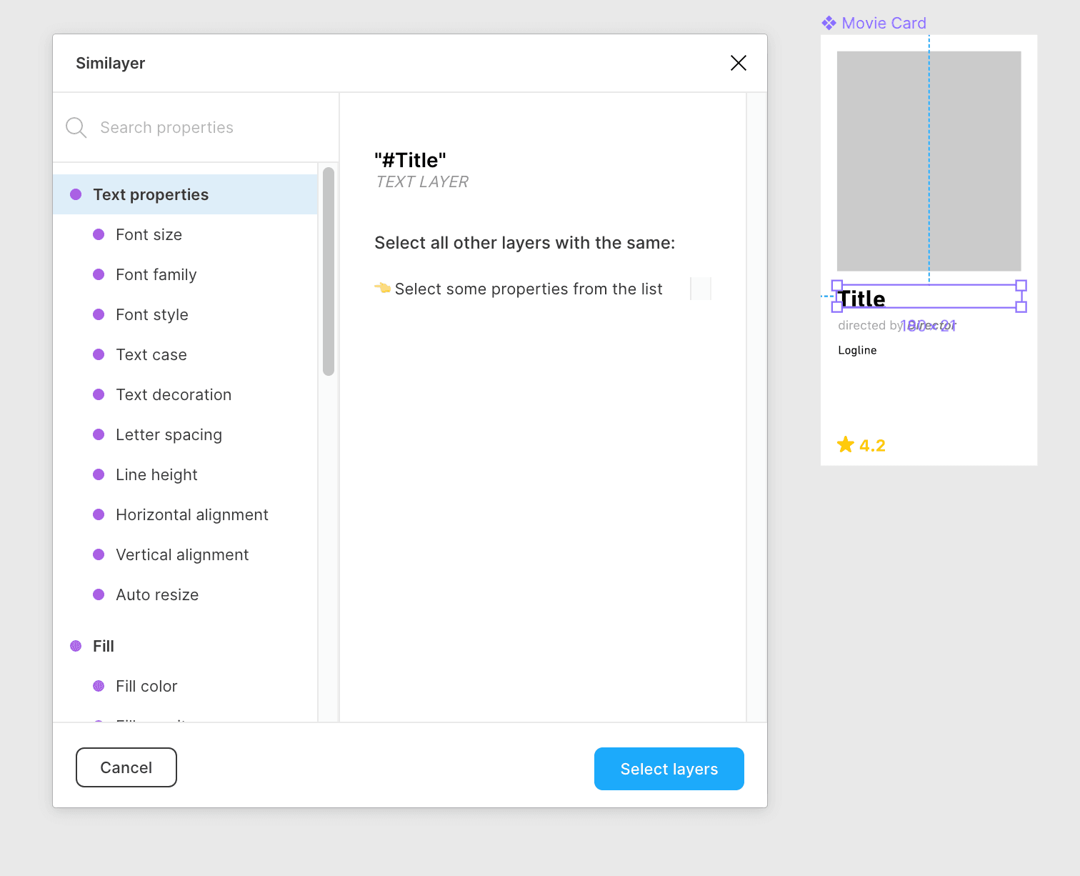 As you can tell from the name, Similayer allows you to select all layers that share the same properties. I found it extremely useful when you have created a bunch of components and want to edit some of the instances. All the properties from the design panel can be used as select criteria.