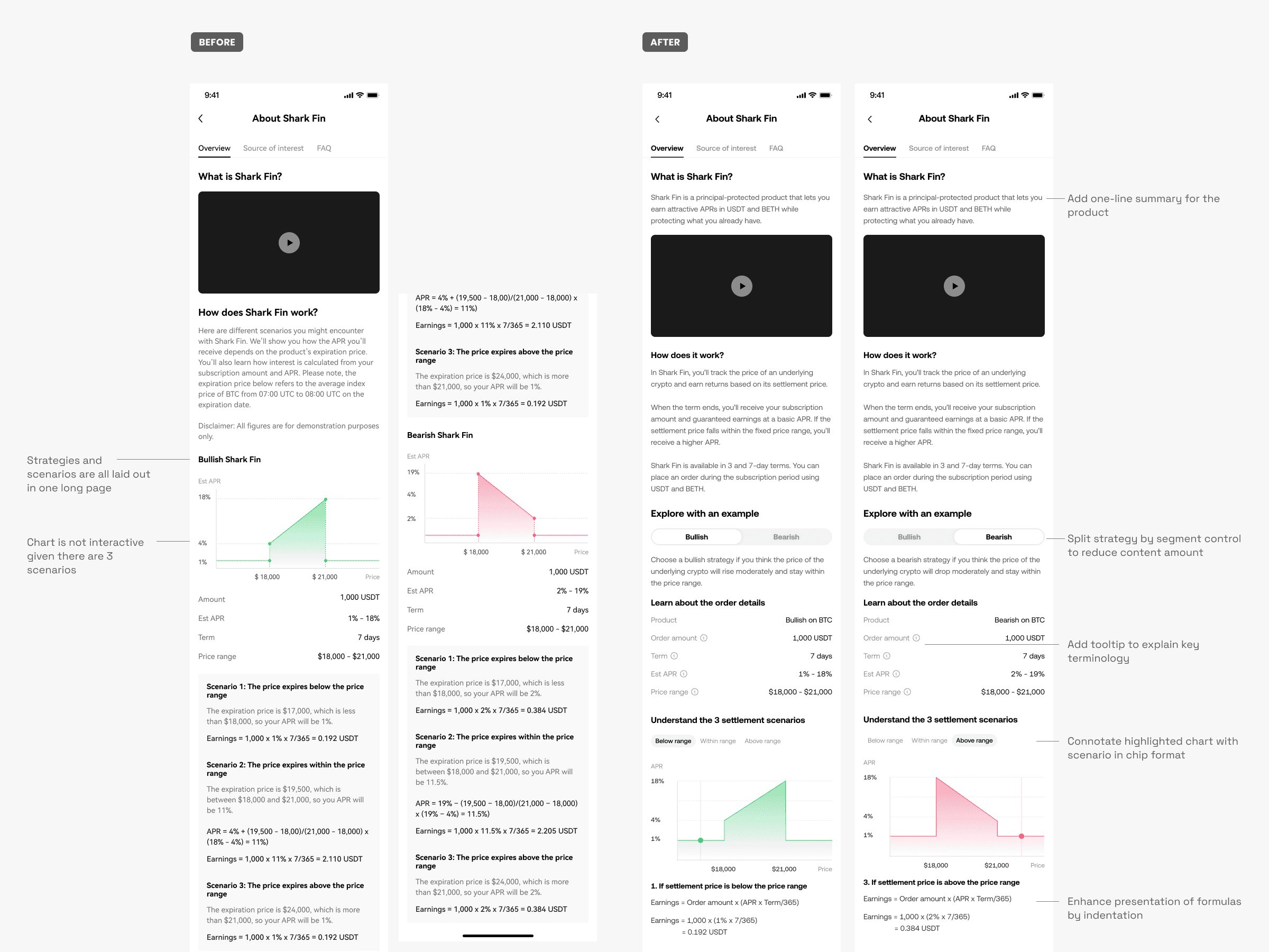 After initial scoping and competitive research, adding a new currency support may seem simple, but the original system is architected toward investing single currency only. The design (how it was marketed in entry points & landing page, subscription flow, historical listing), mental model that the user perceives, as well as content, are required a full end-to-end journey evaluation as scope of change. Raising this to the stakeholders, we’ve gained their support to make the solution toward to the goal to support multi-currency Shark Fin to be scalable and sustainable, instead of quick fix to accommodate one more crypto type.