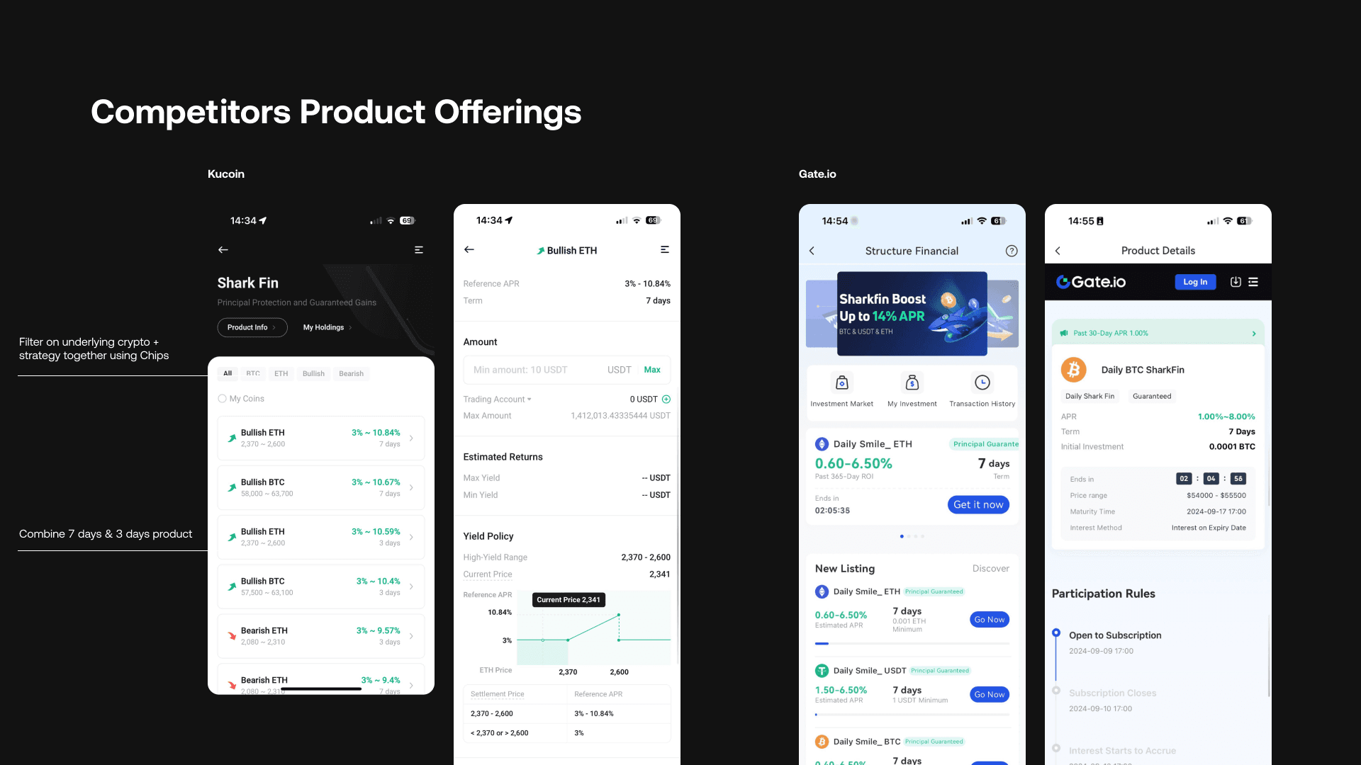 After aligning the goal the team, we identified the landing page as key design challenge to tackle. Landing page lists all available products and we’re adding one more dimension (investment crypto) on top of existing parameters (Term, Strategy, Underlying crypto). Before drilling into the design details, most important thing we identified is to seek alignment regarding the product hierarchy with stakeholders.