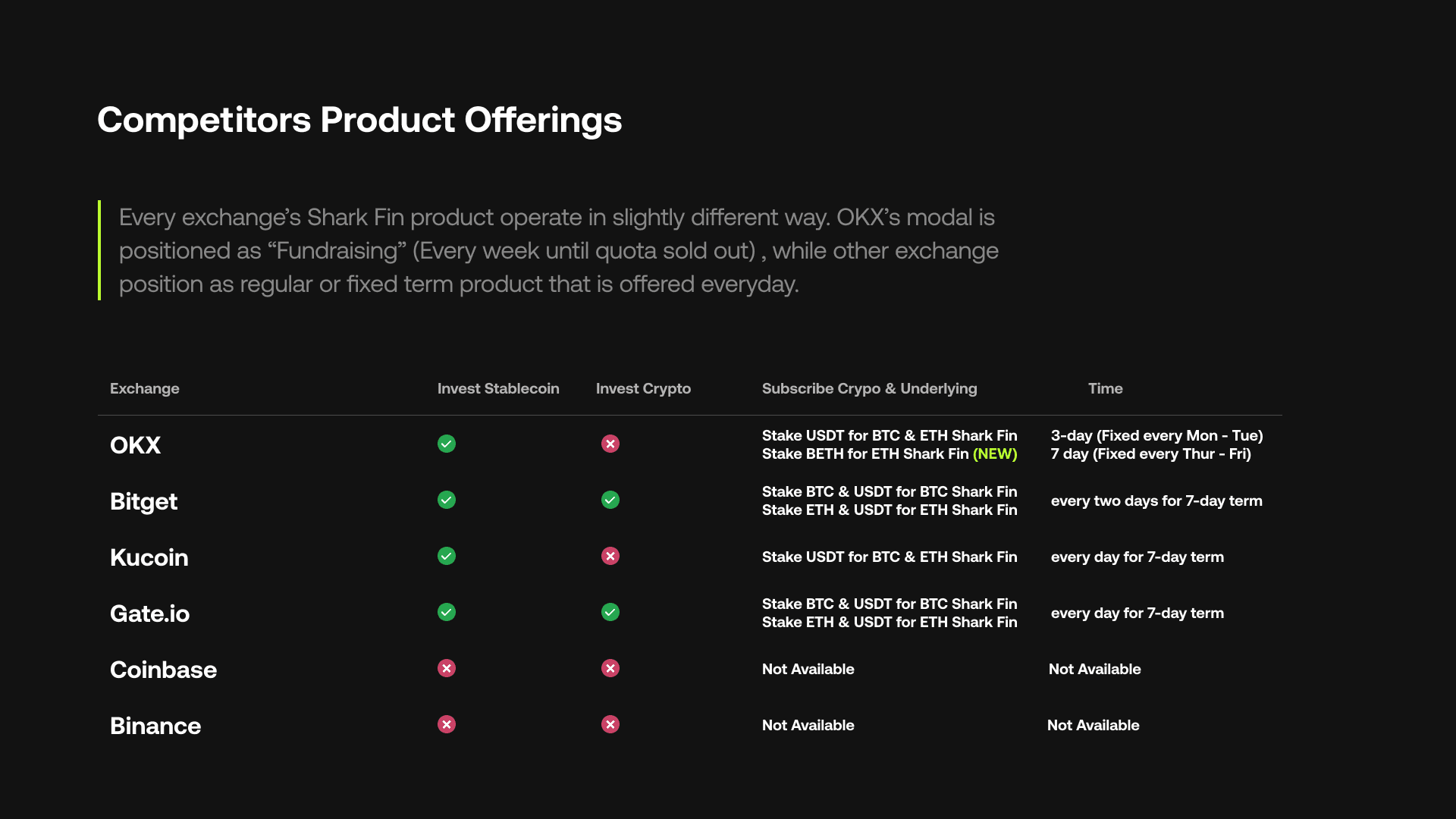 Project goal is to support new crypto (BETH) as soon as possible, aligning to overall business goal to build all-rounded Cefi ecosystem around Ethereum (ETH). Especially for ETH holders who staked ETH within OKX using BETH. It will incentivise them to keep their ETH in OKX ecosystem, exposing to additional financial instruments. BETH Shark Fin also provides additional APR as BETH bear interest everyday.