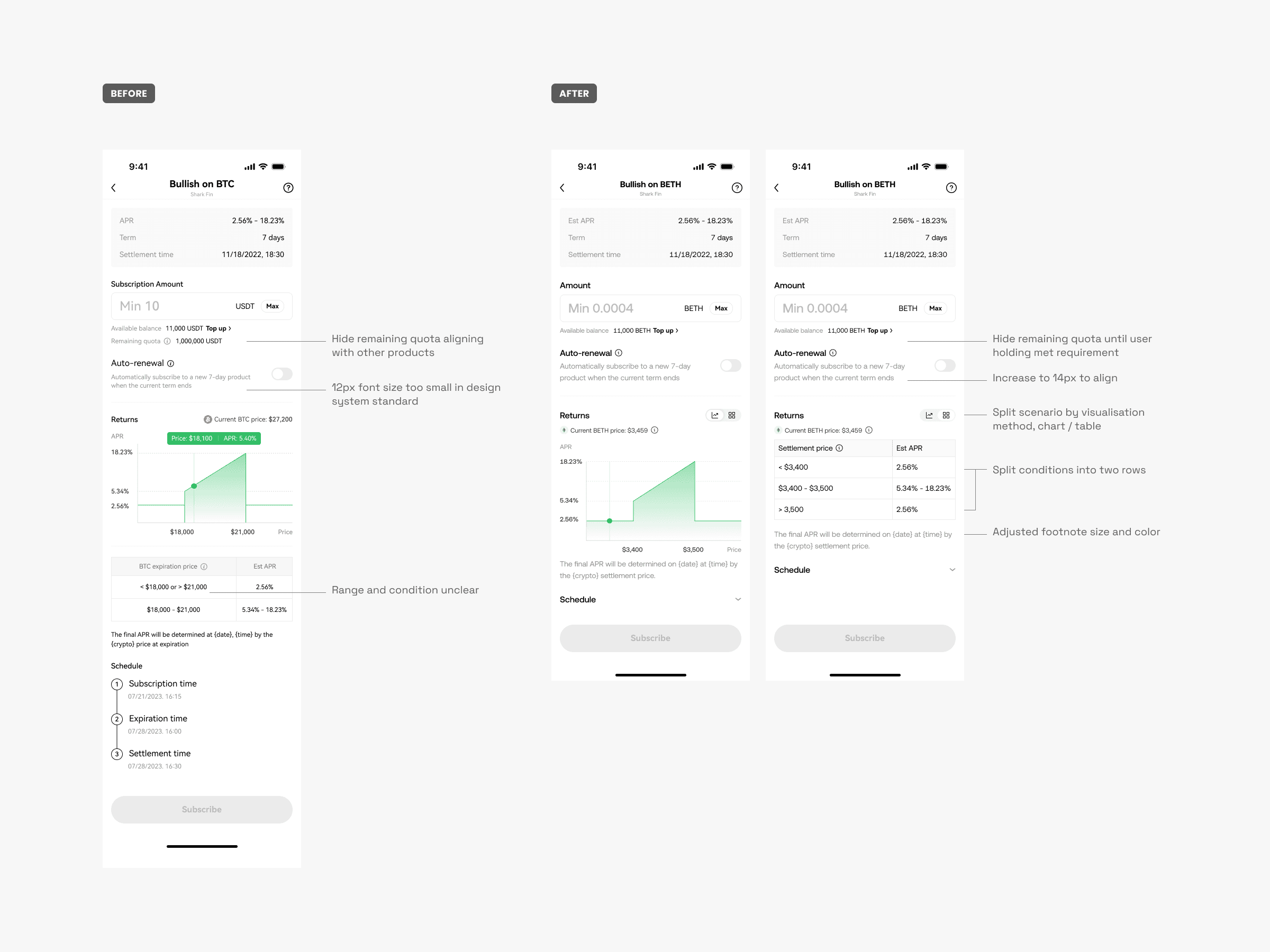 From that, I also clarified about settlement mechanism is specific to BETH, how the behaviour would differ when there are new crypto added. Collecting all the screens (promotion, landing page, subscription), states(adversing, open, partially sold out, sold out and closed) and time of week. I mapped out the whole timeline to illustrate state change for each screens & entry point. Comparing to a normal user flow, such table helped indicate how a component change across time and state, that save time for development. It also has laid the foundation for future work when new crypto need to be added.